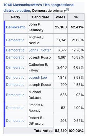 První primárky Johna F. Kennedyho do Kongresu ho postavily proti konkurenci, která zahrnovala i bostonského městského radního Josepha Russa ... a 27letý uklízeč Joseph Russo, který náhodou cítil potřebu kandidovat ve stejných volbách!