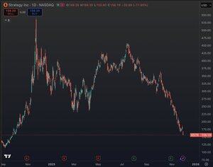 MSTR turun 11,8 persen pada hari setelah tim mengumumkan cadangan kas baru 1,44 miliar dolar dan mengeluarkan panduan bahwa mereka terbuka untuk menjual bitcoin jika mNAV turun di bawah 1.