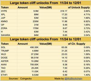 Selama 7 hari ke depan, akan ada pembukaan token besar untuk $HYPE, $XPL, $JUP, $KMNO, $OP, $ZORA, $H, dan $SAHARA.