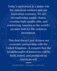 "Questo accordo non solo approfondisce la nostra partnership economica con il Regno Unito, ma garantisce che le scoperte di domani saranno costruite, testate e prodotte sul suolo americano."