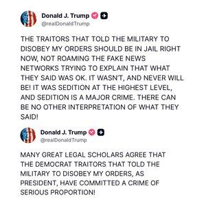 "MOLTI GRANDI STUDIOSI DEL DIRITTO CONCORDANO CHE I TRAITORI DEMOCRATICI CHE HANNO DETTO ALL'ESERCITO DI DISOBBEDIRE AI MIEI ORDINI, IN QUALITÀ DI PRESIDENTE, HANNO COMMESSO UN CRIMINE DI SERIA PROPORZIONE!"