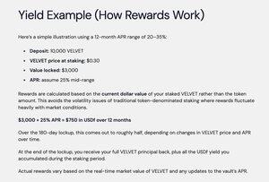 VELVET Vaultは推定APRの20〜35%の範囲、ロックダウン180日、クールダウン3日、@BNBCHAINの上限50Mがあります。