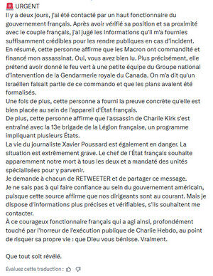 Journalist Xavier Poussards liv er også i fare. Dette er dødsens alvorlig. Frankrikes statsoverhode vil visstnok ha oss begge drept og har autorisert profesjonelle enheter til å utføre dette.