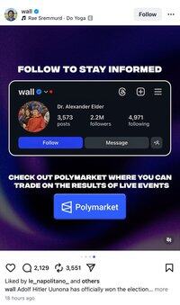 Ik wist niet dat Polymarket ook IG/trad creators ondersteunde. Dat is enorme bekendheid voor hen, aangezien web3-merken traditioneel beperkt zijn tot web3-platforms. De grootste merken schalen al voorbij onze bubbel. 😉