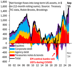 Zagraniczne napływy do amerykańskich akcji (fioletowe) były niezwykle silne od wyborów sprzed roku. Mówi się, że te napływy są zabezpieczone walutowo, ale to najprawdopodobniej nieprawda. To właśnie te napływy spowodowały stabilizację dolara i teraz pchają go w górę...