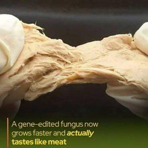 Usando o CRISPR, pesquisadores editaram o Fusarium venenatum, removendo apenas dois genes próprios para produzir uma nova cepa chamada FCPD. O resultado é notável: o fungo aprimorado produz 88% a mais proteína, requer 44% menos açúcar para crescer e reduz as emissões de gases de efeito estufa em até 60% em comparação com a cepa original.
