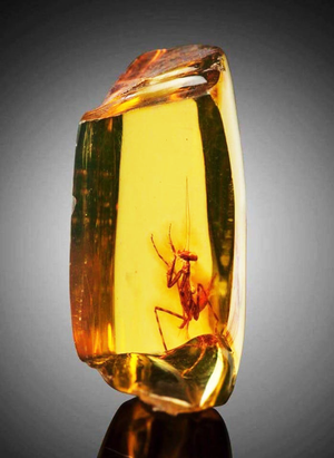 Louva-a-deus presa em âmbar durante 12 milhões de anos.