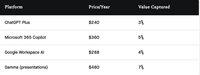 Essa lacuna sugere que um poder de precificação significativo permanece inexplorado, uma vez que a captura total de valor para essas ferramentas é de apenas 5%. A Microsoft anunciou aumentos de preços na semana passada, com o Microsoft 365 E3 subindo de $36 para $39 por usuário mensalmente a partir de julho de 2026 - um aumento de 8.3%, mais próximo de um ajuste de COLA do que de um aumento de preço baseado em valor.