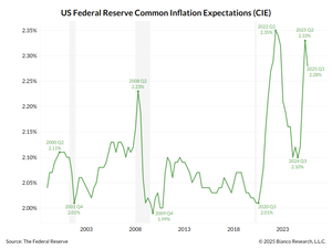Mas se você quer dizer que ambos são igualmente importantes, então o Fed tem uma medida que combina as expectativas de inflação mencionadas acima com várias outras, chamada "Expectativas Comuns de Inflação" (CIE). Ela atingiu o pico em junho de 2022, quando o IPC anual foi de 9%. Este ano, o CIE quase retornou a esse nível máximo.