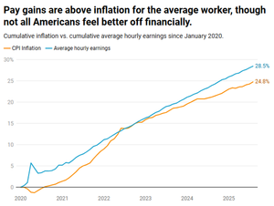 Espere mais pressão em 2026. Já, o Bank of America Institute diz que a inflação está mais uma vez a ultrapassar o crescimento salarial após impostos para os americanos de baixa renda e da classe média.