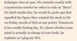 atât de multe detalii din FT Lunch-ul lui Pat Gelsinger, inclusiv cum, în zilele de câștiguri ale Intel, începea dimineața cu numărul de flotări pe care voia să le vadă prețul acțiunilor