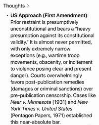**Подход США (Первая поправка)**: Предварительное ограничение предположительно неконституционно и несет "тяжелую презумпцию против его конституционной действительности." Оно почти никогда не допускается, только в крайне узких исключениях (например, перемещение войск во время войны, непристойность или подстрекательство к насилию, представляющее явную и непосредственную опасность). Судебные органы в основном предпочитают средства правовой защиты после публикации (убытки или уголовные санкции) предварительной цензуре. Такие дела, как *Near v. Minnesota* (1931) и *New York Times v. United States* (документы Пентагона, 1971), установили этот почти абсолютный запрет.