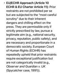**Подход ЕС/ЕСПЧ (Статья 10 ЕКПЧ и Статья 11 Хартии ЕС)**: Предварительные ограничения не запрещены как таковые, но подлежат "самой тщательной проверке" из-за их врожденных опасностей и подавляющего эффекта на прессу. Они допустимы только в том случае, если строго предписаны законом, преследуют законную цель (например, национальная безопасность, конфиденциальность, репутация, общественная безопасность) и необходимы и пропорциональны в демократическом обществе. Европейский суд по правам человека (ЕСПЧ) неоднократно подтверждал, что предварительные ограничения требуют исключительного обоснования, но не являются категорически недействительными (например, *Observer and Guardian v. UK* (дело Spycatcher, 1991)).