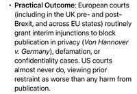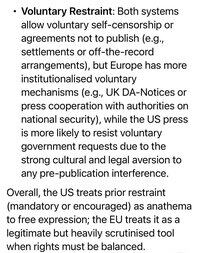 **Практический результат**: Европейские суды (включая суды Великобритании до и после Брексита, а также в государствах ЕС) регулярно выдают временные запреты на публикацию в делах о конфиденциальности (*Von Hannover v. Germany*), клевете или конфиденциальности. Судебные органы США почти никогда этого не делают, рассматривая предварительное ограничение как худшее, чем любой вред от публикации.