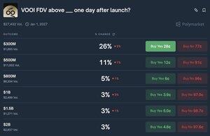 Ймовірність відкриття Polymarket of Vooi з FDV понад $300 МЛН USD FDV наразі становить 26%.