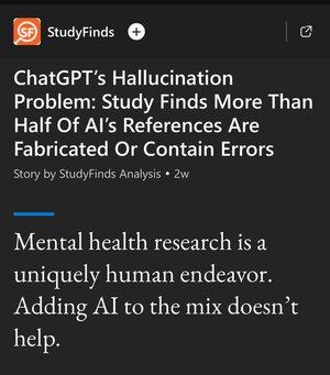 «Дослідження літератури з психічного здоров'я в Університеті Дікіна показало, що ChatGPT (GPT-4o) сфабрикував приблизно одну з п'яти академічних цитат, причому понад половина всіх цитувань (56%) були або фейковими, або містили помилки.»