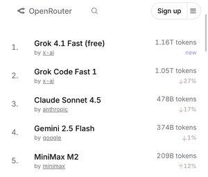 Tin nóng: Grok 4.1 Fast phá vỡ cột mốc 1 triệu token trong chưa đầy một tuần, chiếm vị trí hàng đầu trên OpenRouter