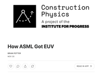 来自@_brianpotter优秀Substack的精彩引用:建设物理学,致敬有志的学术/技术创始人 “EUV故事中的一个重要启示是,开发出有效的技术与在市场上成功竞争该技术是两回事。”