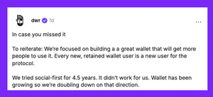 farcaster 正式从一个社交聚焦的应用转向一个钱包聚焦的应用 我认为这并没有改变太多。人们将继续在 farcaster 上发布和浏览内容,但团队将更加专注于构建钱包 + 交易方面。这实际上为他们带来了收入 有趣的是,之前 Dan Romero 对代币非常反感,但这次转变以及 clanker 的收购显然将他置于支持代币的阵营 我将耐心等待 $FARCASTER 😁