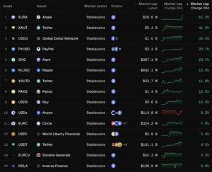 增长最快的稳定币:@AngleProtocol 的 EURA,过去一个月市值增长了 +51.2%。