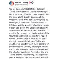 🚨 突发新闻:特朗普总统表示关税拯救了美国,因为最高法院正在决定是否取消这些关税 “由于关税,我们从外国获得了数万亿美元的关税和投资资金。我已经因为关税的威胁停止了八场战争中的五场,如果他们不停止战斗,或者更好的是,如果他们开始战斗。” “几乎没有通货膨胀,而在昏昏欲睡的乔·拜登任内是美国历史上最糟糕的。股市在9个月内第48次创下历史新高。” “对莱昂纳德·里奥、科赫以及所有通过自己的关税多年来剥削美国的国家和卑鄙之徒,我们没有一个法庭系统会让你们再摧毁我们的国家。” “这是美国历史上最富有、最强大、最受尊敬的时刻。11月5日和关税就是原因。感谢您对此事的关注!总统DJT” “做正确的事,最高法院!”