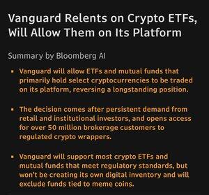 🚨突发消息:根据彭博社的报道,全球第二大资产管理公司Vanguard,管理着约8.7万亿美元的资产,将从明天开始允许在其平台上提供加密货币ETF和精选的加密货币基金, reversing a long held stance.