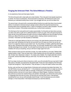 开辟未知之路:没有时间表的磨砺与无情磨练机器的诞生 在追求你人生的事业时,你会面临挫折,这可能会导致你失去所有的努力,必须重新开始。 当一个人失去一切时,回归的道路是孤独的。你做出的牺牲无人可见。一次又一次的挫折相互叠加。有些日子你会感到绝望,你的生活就像一个警示故事。焦虑上升,抑郁悄然来袭。你重温每一个错误。你想象着自己不同的版本,那些版本反映了你最渴望的东西。 但如果你继续前行,拒绝成为受害者,你最终会找到回归的道路。