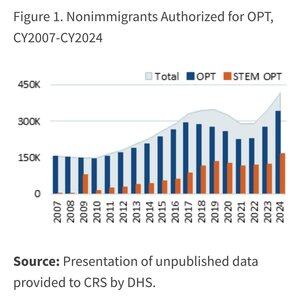 H-1B签证受到了如此多的关注,这很好,但同样应该关注另一个对新美国毕业生造成真正威胁的项目——OPT计划。没有配额,批准数量持续增长:仅在2024年就发放了近40万个工作许可证! 国会从未创建OPT计划——它完全是通过行政法规制定的。这意味着特朗普政府可以结束它,或者至少将奥巴马的STEM三年工作许可证规则恢复为仅一年。