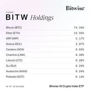 BITW 持有一个包含十种领先加密资产的单一投资组合,这些资产按市值排名,经过风险筛选,并每月重新平衡。并且对最大持有量没有上限。因此,如果将来只有 Bitcoin 是有价值的加密资产,而其他资产归零,BITW 将几乎完全持有 Bitcoin 供投资者使用。但如果最终有八种成功的资产,其中两种甚至尚不存在,BITW 也会持有它们。