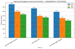 我们没有依赖合成基准,而是使用主网数据测量真实世界的性能,通过分析验证节点链同步日志,收集每个环境中超过 10,000 个区块的 MGas/s 指标。