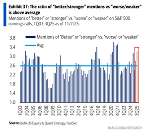 美國高管對經濟和商業環境的樂觀情緒正在上升: 在2025年第三季度的財報電話會議中,標準普爾500指數公司提到「更好」或「更強」的比例與「更差」或「更弱」的比例達到約3.3倍,為2021年以來的最高水平。 這標誌著連續第二個季度的改善。 這一數字也遠高於長期平均水平2.6倍。 在過去25年中,只有5個季度的比例更高。 因此,根據美國銀行的數據,企業情緒指標上升至20年來的第二高水平。 高管的樂觀情緒幾乎從未如此高漲。