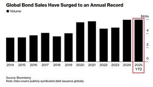 全球債券公司發行量已達到前所未有的水平: 全球債券銷售在2025年前10個月達到創紀錄的5.95萬億美元。 這已經超過了2024年創下的5.93萬億美元的歷史最高紀錄。 自2014年以來,發行量增加了2.5萬億美元。 這一激增是由於信用風險異常低,全球利差徘徊在自2007年以來的最低水平附近。 因此,投資者需求持續顯著超過淨債券供應。 全球債務熱潮正在加速。