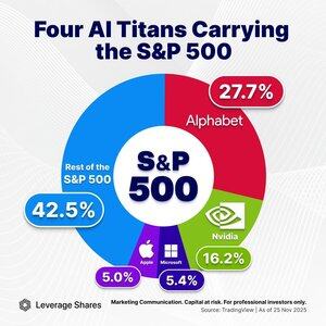 今年有4家公司產生了標準普爾500指數一半以上的漲幅。 $GOOGL、$NVDA、$MSFT 和 $AAPL 一起貢獻了57.5%的總回報。 該圖表突顯出一小群AI領導者如何推動指數表現。
