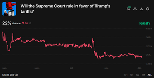 🚨 市場信心因 TRUMP 關稅下滑 Kalshi 交易者現在僅賦予最高法院支持 TRUMP 關稅 21% 的概率。 這一下滑顯示出對於有利裁決的懷疑隨著案件接近決定而上升。