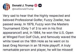 🚨 現在 - 總統 TRUMP:"聽到備受尊敬和喜愛的職業高爾夫球手 Fuzzy Zoeller 去世的消息,感到非常難過。1979年,Fuzzy 在大師賽中獲勝(是唯一在首次參賽中獲勝的三位選手之一!),1984年,他在 Winged Foot 高爾夫俱樂部贏得美國公開賽,並在第18洞揮舞白毛巾,最終在18洞的延長賽中擊敗 Greg Norman。真是一位了不起的人和球員,他將被懷念!" 🙏🙏