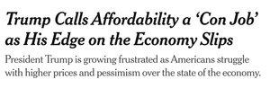 數字顯示: 三週以來談論可負擔性 數千個價格上漲 數百個關稅提高 零實質性政策宣布 數十個謊言聲稱價格正在下降 一位億萬富翁稱你對可負擔性的擔憂為「騙局」。