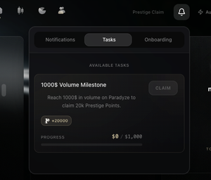 Paradyze 任務現已上線 ⭐️ ✅ 達到 $10,000 的交易量 🏆 獲得 20,000 點獨家 Prestige Points 前 50 位,先到先得。