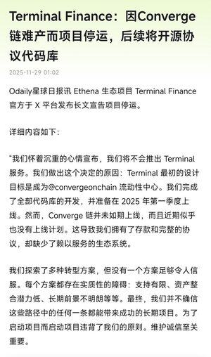 我們懷著沉重的心情宣布,我們將不會推出 Terminal。 我們做出這個決定的原因 Terminal 最初設計為 @convergeonchain 的流動性中心。我們完成了完整的代碼庫,並準備在 2025 年第一季度推出。然而,Converge 鏈並未如預期啟動,近期似乎也沒有計劃推出。這使我們擁有存款和一個完全建成的協議,但卻沒有為其設計的生態系統。 我們探索了多個轉型方案,但沒有一個足夠吸引人。每個選項都有實質性的障礙:支持有限、資產引入潛力低、長期前景薄弱等。 最終,我們並不相信這些路徑中的任何一條會導致成功的長期項目。僅僅為了推出一個項目而推出一個項目違背了我們的原則。保持誠信是至關重要的。 致 Roots 持有者 所有本金都得以保留,所有用戶存款均保持 1:1 的支持。 參與者可以以 1:1 的比例提取他們的存款。 每個當前的 Pendle 位置都有權獲得 Ethena Sats 的收益、與之相關的 sUSDe 收益,以及 etherfi 積分。 艱難的決定 對於我們的支持者、流動性提供者、代言人——我們感到抱歉。這是一個艱難的決定,我們知道這對每個人來說都是痛苦的。我們今天都失去了一些東西。但我們相信這是最誠實和負責任的前進道路。 我們將開源完全審計過的協議代碼庫。Terminal 被設計為一個 MetaDEX,具有新穎的機制來解決由收益引起的暫時性損失,並重新注入收益以賄賂市場,從而自動改善模型經濟學。 感謝您與我們一起走過這段旅程。